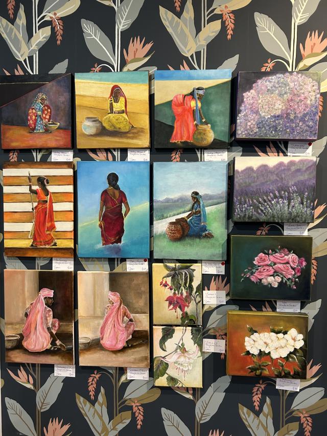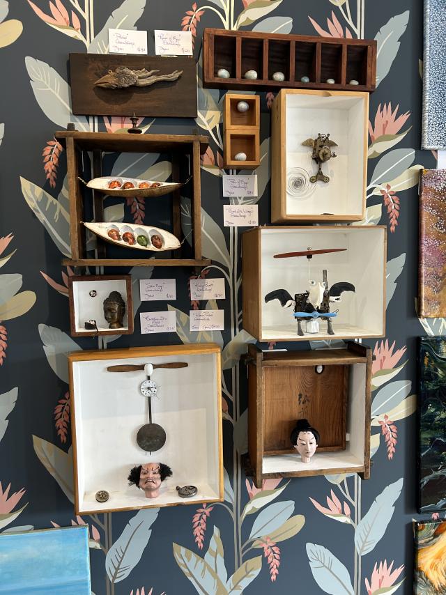 The exhibition features an array of styles and mediums, including Ms McCooey’s acrylic paintings reproduced as prints from her time in India; Ms Rogers’ abstract resin and acrylic works; Ms McGill’s imaginative 3D ‘assemblages’; and Ms Donald’s vibrant knitting and weaving pieces.