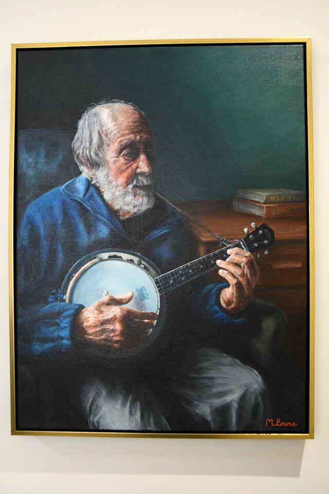 The portrait shows Mr Simmons mid-song, his instrument in hand, captured in a moment of gentle joy.
