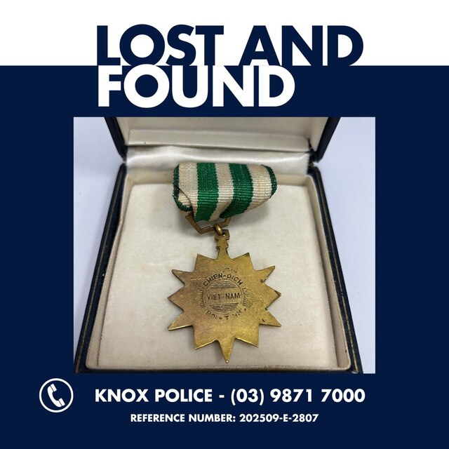 A Vietnam War service medal has been handed in to Knox Police after being found by staff at Woolworths Scoresby on 29 September 2025.