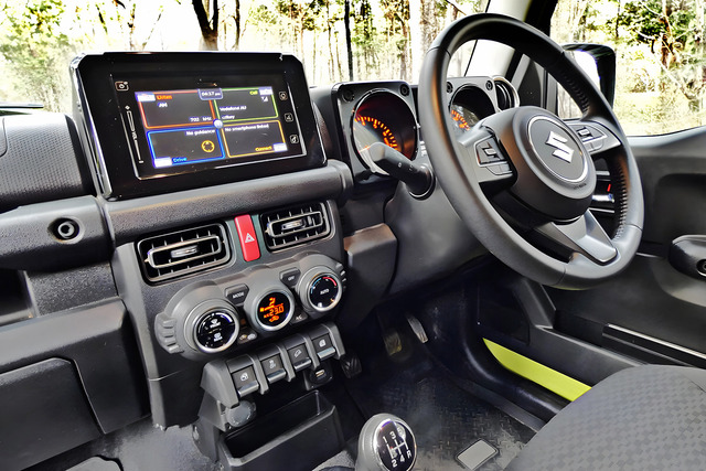 The Jimny XL has a larger 9-inch media screen but it doesn’t come with built-in sat nav like the three-door GXL. Connection to the display is Apple CarPlay or Android Auto, using the phone map app.